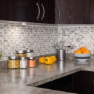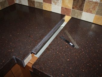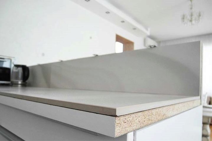 Важно е да обърнете специално внимание на облицовката на всички краища., довършителни работи, които се извършват по аналогия с полагане на плочки върху повърхността на плота. За надеждно закрепване на материала можете временно да използвате строителна лента, в противен случай продуктите могат да паднат. След като лепилото изсъхне, залепената лента може да се отстрани.