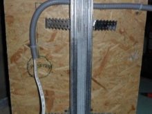 На следващия етап се полагат захранващи линии. Като начало, скобите или скобите са прикрепени по цялата дължина със самонарезни винтове, които ще фиксират кабела, предварително затворен в гофриране. Закрепващите връзки могат да се използват и като закрепващ материал.
