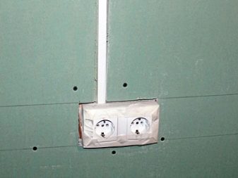 След края на полагането на проводниците започва закрепването на гипсокартона. При което е необходимо да се вземе предвид местоположението на положените кабели, за да не се повреди проводника с самонарезни винтове. След като приключите с монтажа на гипсокартон на местата, където са инсталирани превключвателите и контактите, трябва да пробиете отвори с подходящ диаметър и да инсталирате кутиите за контакти, като оставите кабелите навън за по -нататъшни връзки.
