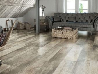 Плочките от порцеланов камък, имитиращи подовата дъска, могат да внесат атмосферата на уютна селска къща във вътрешността на стаята. Често те умишлено се грубоват, за да имитират пукнатини, възли или отлежало дърво. Тези видове могат перфектно да се впишат във всеки стил на градски апартамент, особено полиран, с благородни дървесни текстури – ясен, бук, палисандрово дърво.