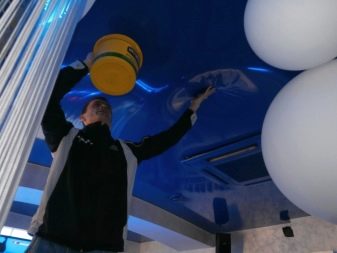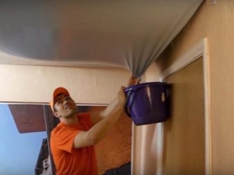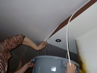 За да се реши този проблем, е необходимо специално оборудване, с което можете бързо да източите водата от тавана, без да повредите самото платно.. Често обемът на водата, който е концентриран в тавана, е много голям, така че няма да е възможно да се постави в кофа или леген. Освен това таванът трябва да бъде правилно изсушен. Ако това не бъде направено, петна и ивици ще останат на повърхността му..