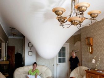 - Наводнение отгоре. Ако височината на провисването е значителна, тогава най -вероятно причината за това е наводнение от съседи. В тази ситуация провисването не е недостатък, а се превръща в негово предимство, тъй като платното не позволява на водата да влиза в стаята, разрушава мебелите и подовите настилки. Ако са използвани тавани от филмообразен тип, предаващи светлина, след източване на водата те много бързо ще се върнат към първоначалната си форма.