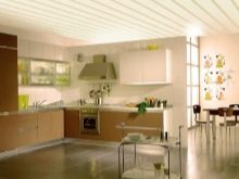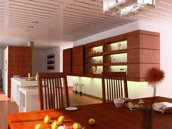 Днес има много възможности за декориране на стаи с решетъчни тавани. Такива системи за окачване изглеждат красиви в кухнята. За разлика от други видове декоративни облицовки, повърхността на тавана от ламелите е устойчива на механични повреди и влага. За кухнята можете да изберете едноетажни и многостепенни тавани от ламели в сиво, бяло или кафяво. Дизайнът на тънки ламели с цветни вложки изглежда оригинален.