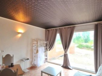 Тези модели изглеждат много хармонично в интериора. Ширината на плата ви позволява да направите безшевен таван с дължина и ширина до 5 метра. Материалът е по -малко податлив на температурни промени и прекомерен студ. Таванът няма да се напука и свие при всякаква температура. Благодарение на това, когато инсталирате продукта, няма нужда да използвате термопистолет. Следователно такива тавани са лесни за сглобяване и разглобяване без майстори. Цената на конструкцията е по -висока, отколкото при работа с PVC платно.