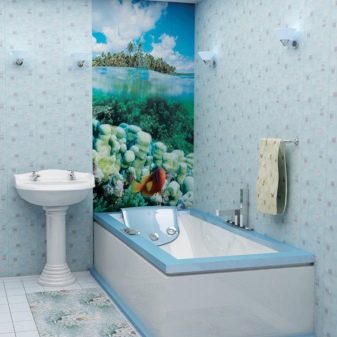 Още по -лесно е да изберете интересен интериор за баня. Панелите с шарка за малки мозайки или мрамор изглеждат идеално. Те изпълват пространството на банята със специален чар. И можете да им придадете малко претенциозност поради формоването със златни и сребърни елементи. 3D панели с морска тематика превръщат познатата баня в тропически оазис.