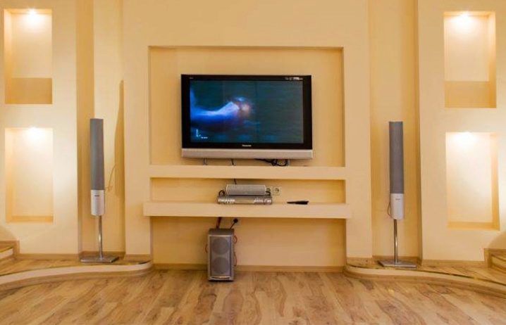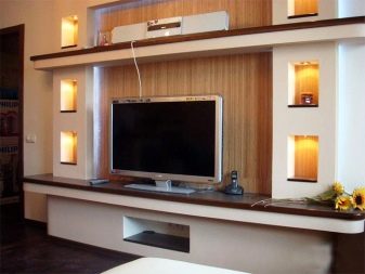 От друга страна, рафтовете от гипсокартон не могат да се преместват или продават като мебели. За разлика от пиедесталите, телевизионните конструкции, използващи рафтове от гипсокартон, са по -функционални. Можете да инсталирате допълнителни стенни или прожектори, LED лампи и ленти.