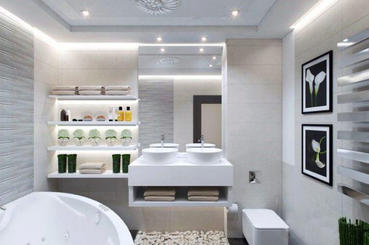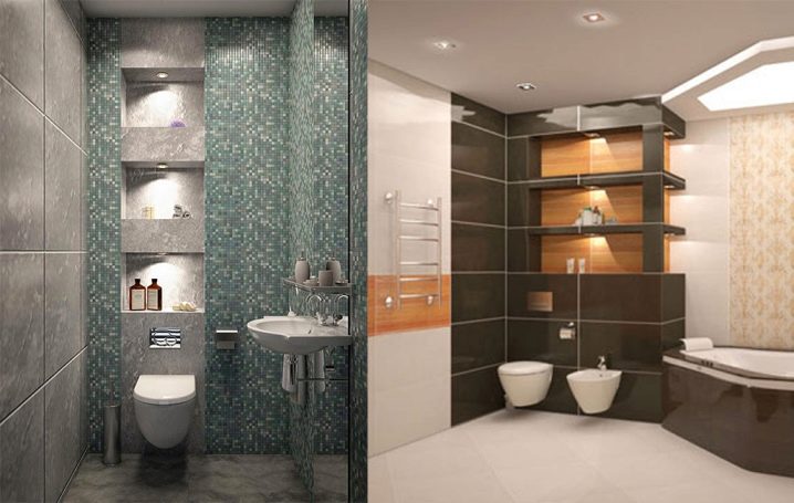 - В банята и тоалетната поради ограниченото пространство е трудно да се намерят рафтове и шкафове. По-лесно е да се реши проблемът с организирането на пространство с помощта на конструкции от влагоустойчив гипсокартон.