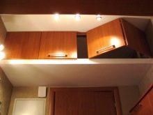 Следващата стъпка е да поставите подсветката, ако е планирана. Всички проводници са скрити в пластмасова гофрирана кутия. След това гипсокартонът е прикрепен към самонарезни винтове или течни пирони. Структурата е готова, можете да продължите към довършване.