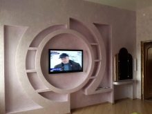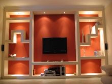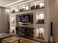 - Можете да направите ниша за телевизор и уреди от гипсокартон, да монтирате цял ансамбъл от рафтове, които да заменят мебелната стена.
