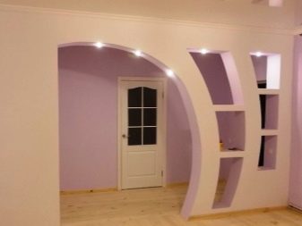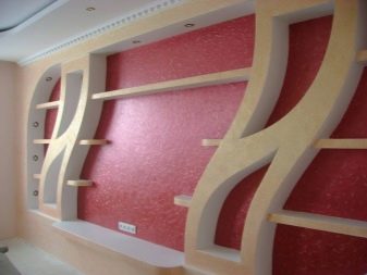 Гипсокартонът ви позволява да изграждате структури с различни форми. Самите рафтове могат да бъдат с всякаква форма (дори асиметрична и наклонена). Всичко е ограничено от пространството на стаята и въображението на дизайнера. Често гипсовите плоскости се използват за създаване на вградени гардероби и стени. Това ви позволява да изградите структура, която ще замени мебелната стена..