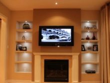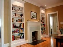 - Ако стената има ниши или изпъкнали конструктивни елементи, те могат да бъдат победени. Ако част от стената с камина стърчи напред, образуваните ниши трябва да бъдат запълнени с рафтове.