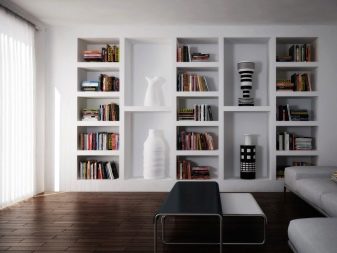 Наличието на рафтове около отворите на прозорците и по стените няма да намали нивото на шума. Структурите на GKL ви позволяват да спестите от мебели (стелажи, отворени рафтове, изработени от други материали, странични маси и маси за телевизори). Но в това има и недостатък. За преместване на конструкцията ще е необходимо демонтиране с последващи ремонтни дейности..