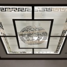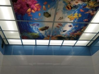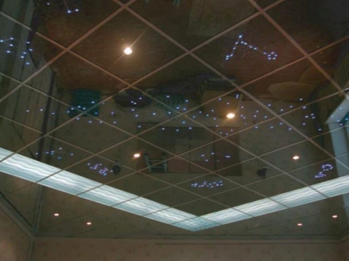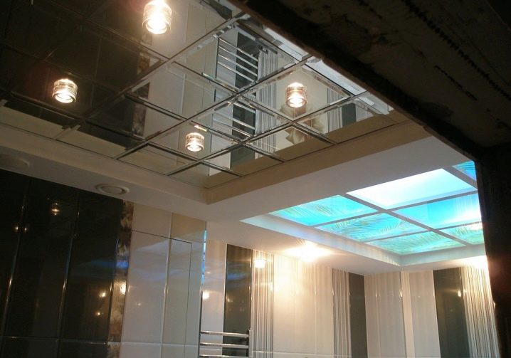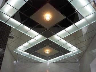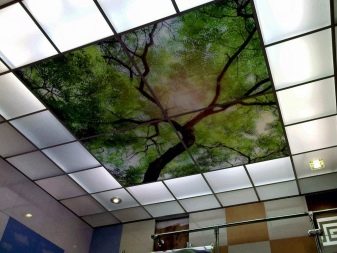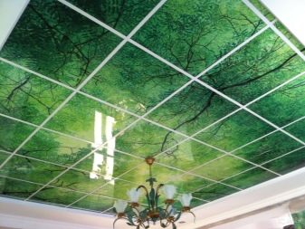- Художествени, декоративни елементи. Например, огледални плочи Това е уникално дизайнерско решение, което ще отрази цялата стая. С помощта на такъв таван можете визуално да разширите пространството. Технологията предвижда нанасяне на огледален филм върху стъклен лист. Таванът с фотопечат също е смело решение, което непрекъснато ще привлича гости в дома ви. Всяко изображение, което харесвате, се нанася с филм върху стъклото, след което те се наблюдават. Таваните с вложки изглеждат изящни.