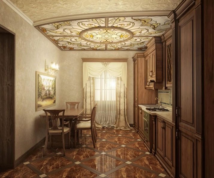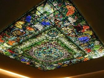 Покритието с витражи или с машинно покритие от стъклопис ще бъде подходящо за разглеждане на помещения, направени в английски, африкански, гръцки или римски стилове. Огледалната версия ще бъде подходяща в помещения, които са направени в стила на минимализма, модерен, хай-тек. Таванът за отпечатване на снимки може да се монтира в китайски или японски стаи.