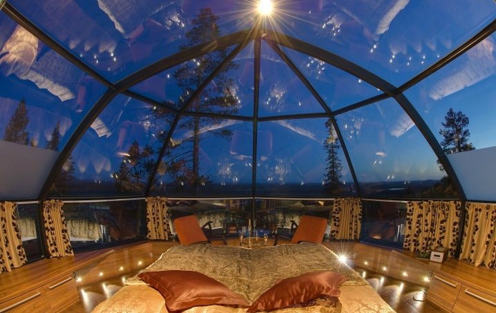 Прозрачният стъклен таван с изглед към откритото небе е смело решение, което ще ви позволи да се любувате на природата, докато лежите на леглото си. Тази опция се използва активно от дизайнерите при декориране на стаи в модерни стилове, като хай-тек, арт деко, поп арт..