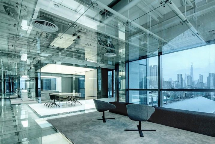 Стъкленият таван в офиса изглежда елегантен и строг.