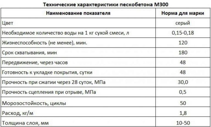 В същото време пясъчният бетон М-300 демонстрира жизнеспособност до 120 минути, което ви позволява да извършвате работа с оптимално темпо (без излишно бързане), дори при липса на строителни умения. Съставът има саморазливна способност, с други думи-саморазливна пясъчно-бетонна смес при изливане не отнема много време и усилия за изравняване на повърхността.