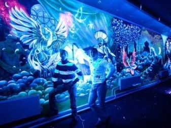Основата за флуоресцентни състави може да бъде от всякакъв цвят, те дори могат да бъдат приложени към други дизайни, направени по конвенционални средства. Флуоресцентните бои не са вредни за здравето, така че могат да се използват в домове и места, където има голям брой хора.