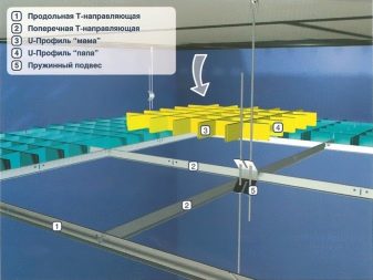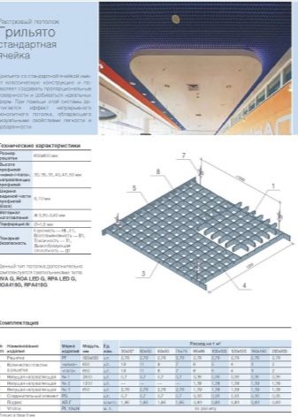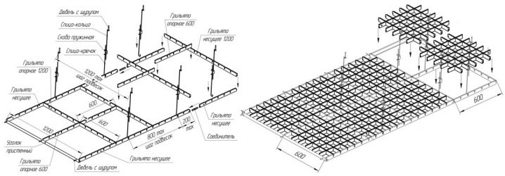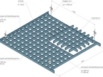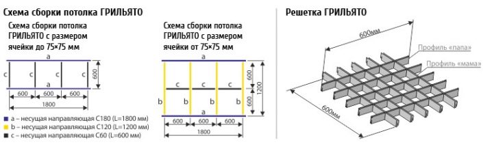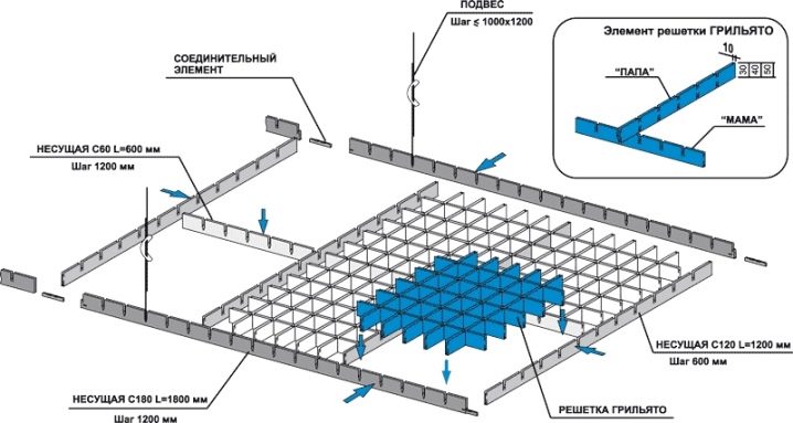 Конструкцията на решетката се състои от алуминиеви профили или дървени елементи. Дебелината на профила обикновено не надвишава 5 мм. Ширината е от 3 до 5 см. Клетките имат размери от 3 × 3 см до 20 × 20 см. Профилите на майстора се наричат „мама“ и „татко“. Те са здраво закрепени към метални релси, закрепени заедно. Релсите са със стандартни размери 60, 120, 180 и 240 см. Системата е здраво закрепена към основата на тавана с помощта на специални леки и надеждни крепежни елементи.