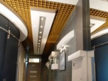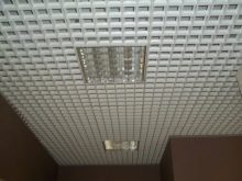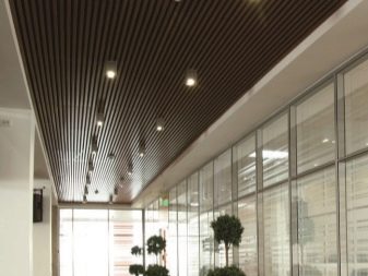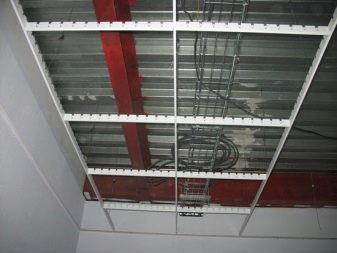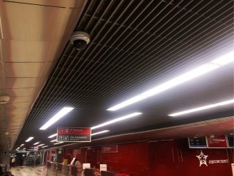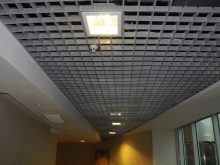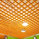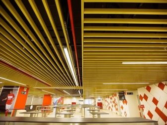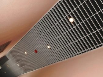 - “Щори” така наречен за сходство с устройство, което замества завесите. Клетките са продълговати, направени от дебел метален профил. Следователно цената е подобна на стандартния таван. Те се избират най -често поради високата си функционалност. Видимостта през тях е минимална, но удължените отвори позволяват засилен обмен на въздух. Следователно, в помещения, където е необходимо въздухът да циркулира, да се почиства от миризми и дим, изпускателните системи могат да бъдат разположени зад такъв таван. За декоративни цели „щорите“ могат да се използват като имитация на ламелен дървен таван.