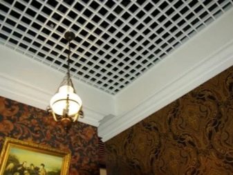 Неокласическият стил с масивни полилеи, имитационни свещници и изобилие от позлата добре ще балансира растерния таван. По -светлият нюанс ще изглади и успокои закачливия декор. Малките клетки няма да нарушат стила на стаята и визуално няма да изкривят нейните размери.
