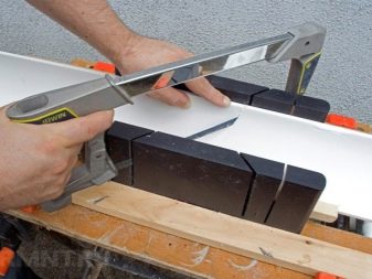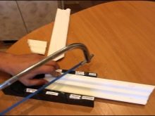 Но с дърво и пластмаса можете да се справите с друг добре известен дърводелски инструмент – митрална кутия, сдвоена с ножовка. Този инструмент е под формата на поднос, направен или от дърво, или от пластмаса, или от метал. В двете успоредни странични стени на скосяващата кутия има прорези за лесно рязане на цокъла под желания ъгъл. При проста модификация на инструмента, таванният елемент може да се реже под ъгъл 45 или 90 градуса, а в по -сложен вариант, цокълът може да се реже под ъгъл от 60 градуса..
