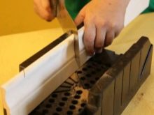 Пръчката, поставена в кутията за гладко рязане, трябва да се притисне към страничната стена, като се постави възможно най -близо до слота. Като държите детайла с лявата си ръка, трябва внимателно да направите разрез и да го оставите настрана. Втората половина на перваза трябва да се изреже по същия начин, като не забравяте да го обърнете с лицето надолу.