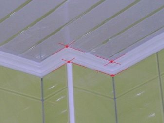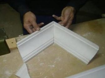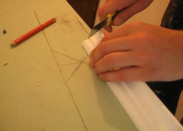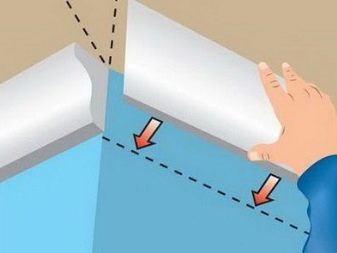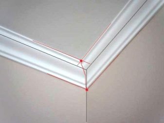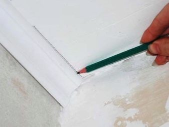 За да изрежете правилно и след това да съедините половинките на перваза за вътрешния ъгъл, трябва да измерите на място с обикновен молив. Десният детайл трябва да се приложи към ъгъла от съответната страна, докато спре. Начертайте линия върху повърхността на тавана по половината и отстранете детайла отстрани. Правим същото с другата половина..