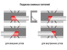 Същите методи и инструменти могат да се използват за съединяване на половинките на перваза във вътрешния ъгъл. Разположението на половинките в кутията за рязане при рязане за вътрешния ъгъл е идентично с разположението на частите, използвани за свързване на външния ъгъл. Но не е нужно да завъртате дясната половина на цокъла за рязане, а само да променяте наклона на среза (използвайте различен разрез). Във всеки случай, от лявата страна на перваза, линията ще бъде наклонена вляво от ъгловата точка, разположена от страната, съседна на стената, а от дясната страна на перваза, линията ще бъде наклонена до вдясно от подобно разположената точка.