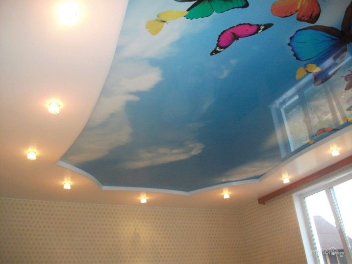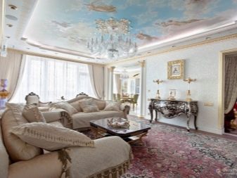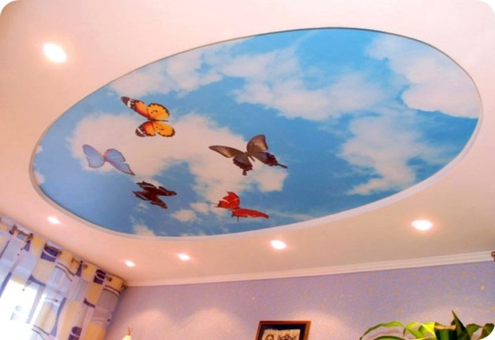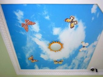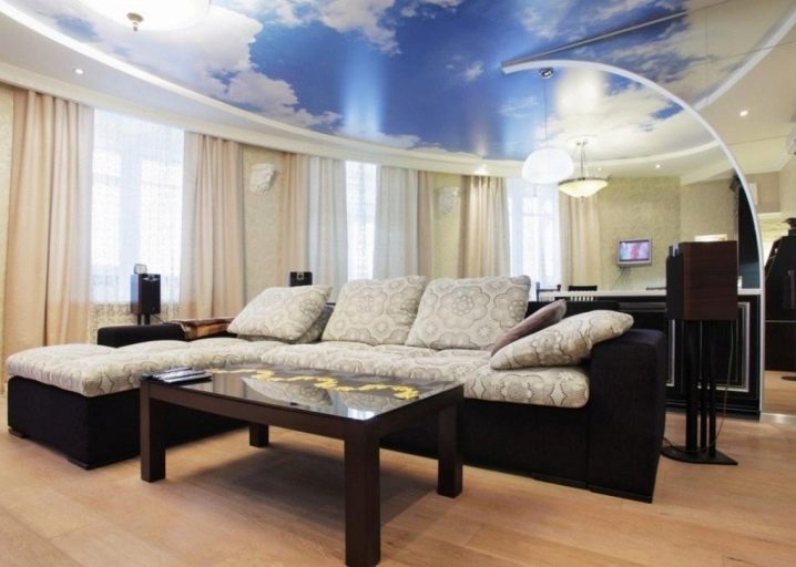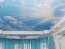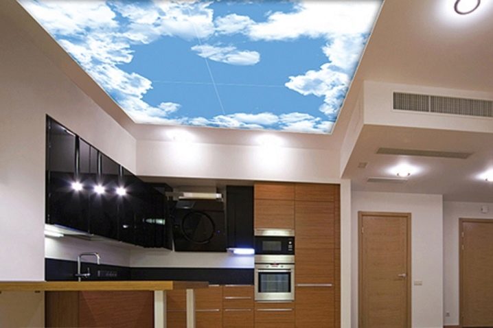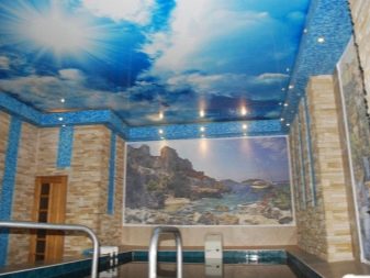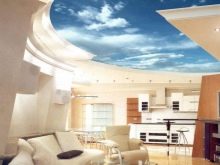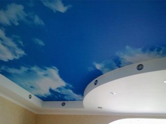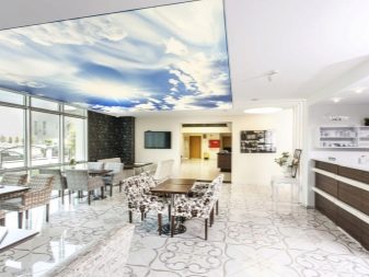 Що се отнася до изображението на светло синьо небе с облаци, неговият обхват също е доста широк. Тези тавани са подходящи за тематични търговски площи, козметични салони, семейни кафенета и т.н. Дневното небе изглежда добре в същите басейни. Такъв таван е подходящ не само за модерни, но и за класически интериорни стилове..