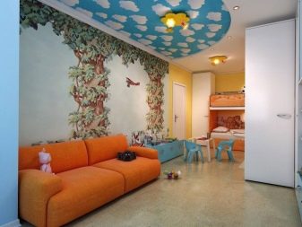 За детска стая са подходящи изображения, чиято цветова гама не се ограничава само до сини и бели нюанси. Можете да добавите ярки цветове: розово, метличина синьо, зелено и други. Това могат да бъдат такива интересни акценти като балони в небето, пеперуди или нещо друго..