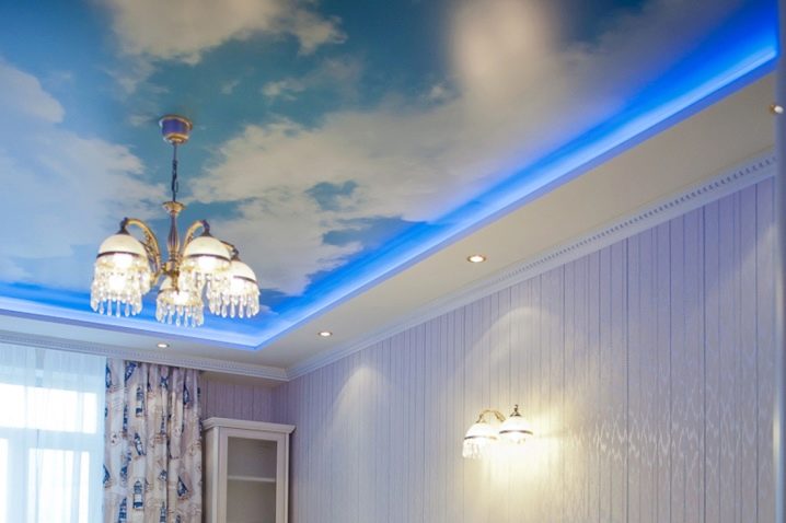 В някои случаи LED ленти се вкарват в опънати тавани. Те блестят през полупрозрачен материал, осигурявайки ефект на блестящи слънчеви лъчи или искрящи звезди. Подсветката прави изображението възможно най -реалистично. Колкото по -светъл е фона на покритието, толкова по -ярък е блясъкът..
