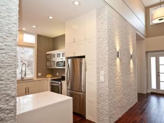 Мазилките, имитиращи камък, са подходящи за класически кухни. Те дават еднакво привлекателен ефект в обстановка в стил Арт Деко, в минималистичен и модернистичен интериор. Най -сложната и аристократична версия на този дизайн е венецианското покритие. Чрез добавяне на малки трохи от различни състави, той може да възпроизведе външния вид на гранитни, мраморни, кварцови и ониксови повърхности. Има опции, покрити сякаш с травертин, малахит, яспис.
