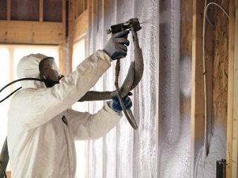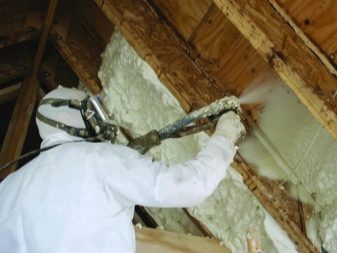 Що се отнася до полиуретанова пяна, тя може да се използва за цялостно изолиране на всяка структура. Той е направен от два компонента, поради което структурата му, когато се втвърди, придобива вид на затворени клетки. Следователно полиуретановата смес е устойчива на паропропускливост и пропускливост на влага.. Тази пяна се нанася на малък слой от 6 cm, обикновено една кутия за пръскане е достатъчна за 1 m².. Работата с материала трябва да се извършва при температура най -малко 25 ° С.
