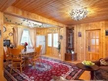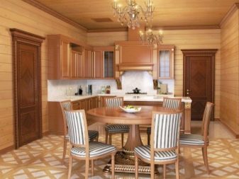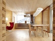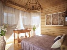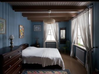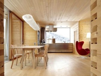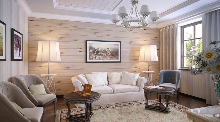 Невъзможно е да се обшият всички стени и тавани само с плоскост, дори ако традиционният руски стил е взет за основа. Това ще донесе усещане за тежест и необитаемост. А дървесната текстура се нуждае от контраст за изразителност. Най -добрите посоки за нея са Прованс и кънтри, хармонично съчетани с дървени мебели..