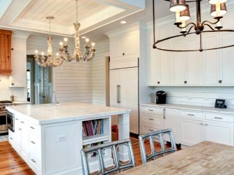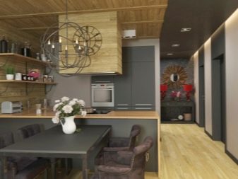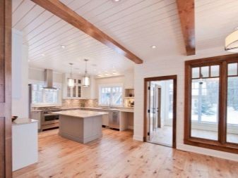 Частичната употреба с боядисване на тавана изглежда не по -малко оригинална.. Например, можете да боядисате гредите в различен цвят. Когато избирате сложна таванна конструкция, можете да добавите позлатени елементи и необичайна форма на лампи към дизайна. Добро решение би било да се използват в допълнение към облицовката подобни мебелни фасади. Например, можете да обшиете тавана или преградата с ламели, да изберете подобен цвят за масите на кухненските мебели..