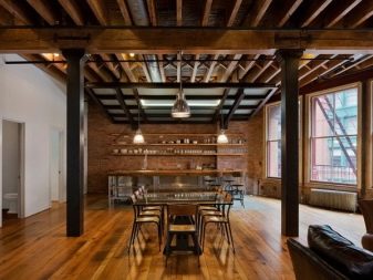 В стаите на апартамента идеален вариант за довършителни работи ще бъде материал, изработен от естествено масивно дърво, той ще придаде на интериора специален шик и ще запълни пространството с приятен аромат на дърво. В жилищните помещения можете да скриете гредите под шарнирните конструкции.