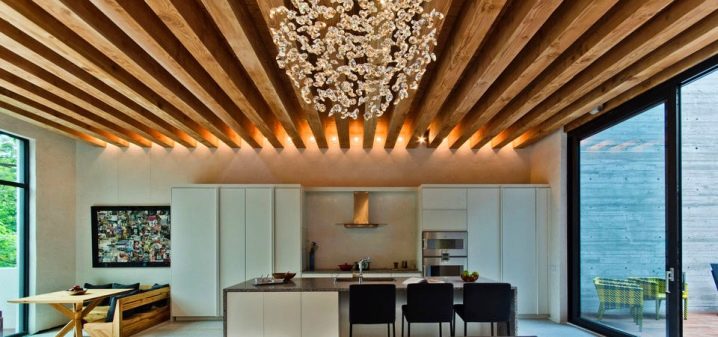Дървени греди се срещат както в апартаменти в стар стил, така и в много селски къщи. Обикновено те са разположени по целия периметър на помещението и са направени от евтини дървесни видове. В същото време в селските райони можете дори да видите трупи под формата на кръгъл дървен материал. Гредите в конструкцията изпълняват не само ролята на носещи елементи, но често са в основата на тавана.. Ако обмислите правилно дизайна, те могат да бъдат превърнати в прекрасен декор..