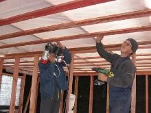 - Следващата стъпка в работата ще бъде монтаж на топлоизолация., той ще запази топлината в помещението и няма да позволи потоците на студения въздух от покрива или между етажите да се припокриват. Това важи особено за облицовката на първия етаж в апартаменти. Като изолация се използва минерална вата или пяна.