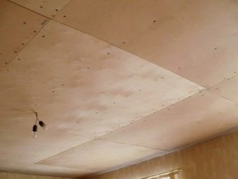 - Шперплат. Ако текстурата на дървото не е важна за интериора на помещението, тогава таваните се облицоват с шперплат, привличат се със самонарезни винтове и се заковават. В този случай трябва да обърнете внимание на дебелината на гредите, тъй като този материал е тежък. Дебелината на листовете се избира в зависимост от разстоянието между изоставанията. В края на обвивката шевовете са запечатани с шпакловка за дърво или мастика. След това повърхността е добре грундирана и покрита с финишно покритие..