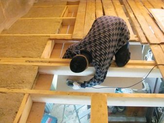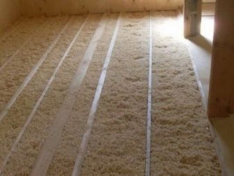 - На първо място, трябва да създадете пароизолация и да затворите гредите. Това е най -добре да се направи с пластмасова обвивка или пергамент, които могат лесно да бъдат закрепени с телбод. След това трупите трябва да бъдат избити с всеки груб материал, най -често за такива цели се използва кантирана дъска. Ако таванът се окаже крив и подовете имат различия в нивата, той трябва да бъде изравнен.