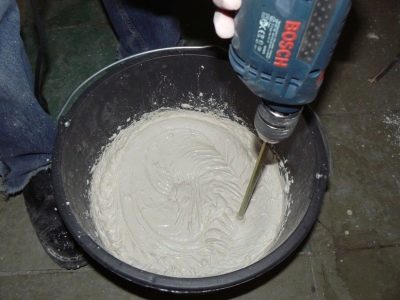 - За да приготвите разтвора, вземете 1 кг от сместа и 0,5 л вода. Съставът не се препоръчва да се прави на големи порции., тъй като изсъхва много бързо. За смесване вземете строителен миксер и разбъркайте, докато сместа изглежда като заквасена сметана.