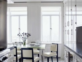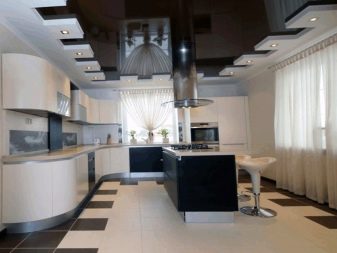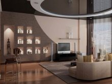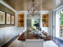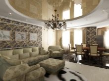 Все по -често има такава тенденция в интериора като студио. В него една стая е предназначена за различни цели, затова е препоръчително да я зонирате с помощта на декоративни техники. Например, ярък фрагмент от опънат таван може да подчертае пространството на трапезарията..