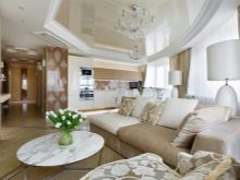 Стил модерен отличава се с изящни линии. Например флоралните щампи върху тапета са комбинирани с изящното ковано желязо на таблата и краката на масичката за кафе. Тук лъскавите тавани ще изглеждат най -впечатляващи. Цветът на панела трябва да поддържа цялостния цвят на интериора. Перлено сиво, светло лилаво и други сложни нюанси изглеждат красиви.