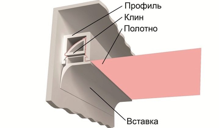 Така че, платното трябва да бъде изрязано точно до размера на стаята. По периметъра му е заварен или твърд алуминиев профил, или мек PVC профил, така наречения харпун. Той е фиксиран вътре в закрепващия профил, разположен в горната част на периметъра на помещението. При нагряване на кърпата с термопистолети тя се опъва под тавана.