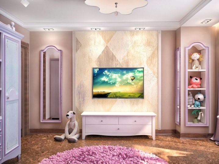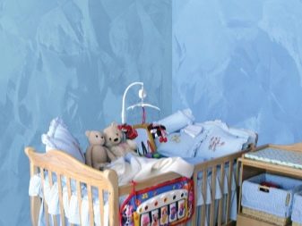 За детска стая декорирането на стени с венецианска мазилка е най -правилният и безопасен вариант, тъй като такова покритие не е вредно за здравето. За детската стая не се препоръчва използването на наситени нюанси на гипсовата смес (червено, тъмно синьо), тъй като такива цветове влияят негативно върху психиката на детето. По -добре е да използвате спокойни нежни тонове (бежово, нежно розово, синьо). Освен това можете да украсите детските мебели със слоеве декоративна мазилка..