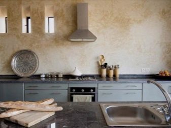 Венецианската мазилка често се използва като довършителен материал в кухнята, тъй като такова покритие може лесно да се почиства със сапунена вода.. За малка стая се използват по -топли цветове., в хармония с интериорните предмети. Зоните на стените, където се намират мивката и печката, са най -добре облицовани с плочки. Ярките крещящи нюанси на мазилката по стените ще изглеждат агресивни и неестествени.