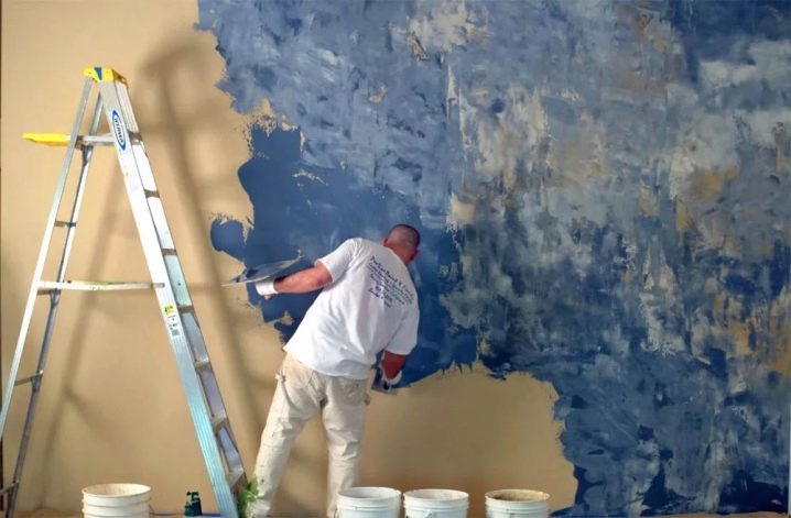 За да създадете образа на хола, можете да използвате най -оригиналните опции. За да се постигне ефектен външен вид на венецианската по стените, се препоръчва да се вземе решение за избора на осветление в стаята. В такава стая е по -добре да използвате заглушени монохроматични тонове (бежово, синьо, сиво, светло синьо). Живописта и рисунките се използват като декорация, но ще са необходими много усилия, за да ги приложите..