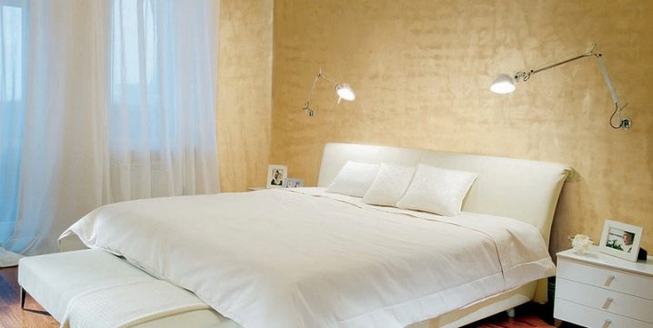 В просторна спалня може да се използва голямо разнообразие от венециански дизайни. Можете да използвате венециански, който имитира старо кадифе с нанесена картина. Възможно е също така да се комбинират различни цветови нюанси, които са в хармония с интериорните предмети. Не се препоръчва нанасянето на мазилка с тъмен цвят в малки спални., в този случай стаята се намалява визуално няколко пъти. По -добре да изберете неутрални пастелни цветове, които успокояват и успокояват.