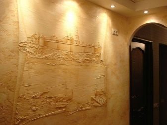 - Рилиево. Това текстурирано покритие осигурява ефекта на вълнообразна повърхност. Препоръчва се използването на интериорни материали Rilievo. За да се засили ефектът, покритието често е остъклено. Цветовете на такива мазилки обикновено са неутрални, затова с тях често се използват Velature материали (декоративни дизайнерски оцветяващи композиции)..